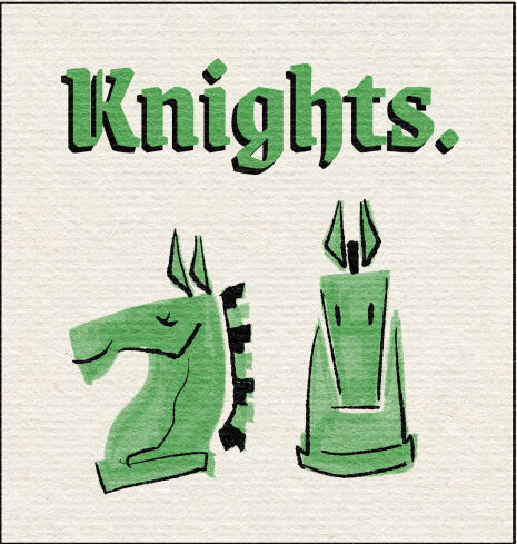 Knights are long-nosed chessmen with the ability to make powerful jumps. They are naturally fit and often athletically inclined. Many knights thrive in competitive environments and love challenging themselves to get better at whatever it is that they enjoy the most. Most of them have a profession, combat style, sport, or game that they toil endlessly to improve at.