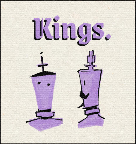 Kings are the largest and slowest type of chessman. Natural born leaders, they are the anchors around which other chessmen tend to congregate, the pillars of society itself. A good King is noble, wise and fatherly and makes use of his command and resources to ensure his people are fulfilled. They are often judges, commanders, tacticians, and directors; in whatever role they take, they are the establishers and symbols of the law and order that other chessmen strive to uphold, and the chief executors of that law.Kings are always male.