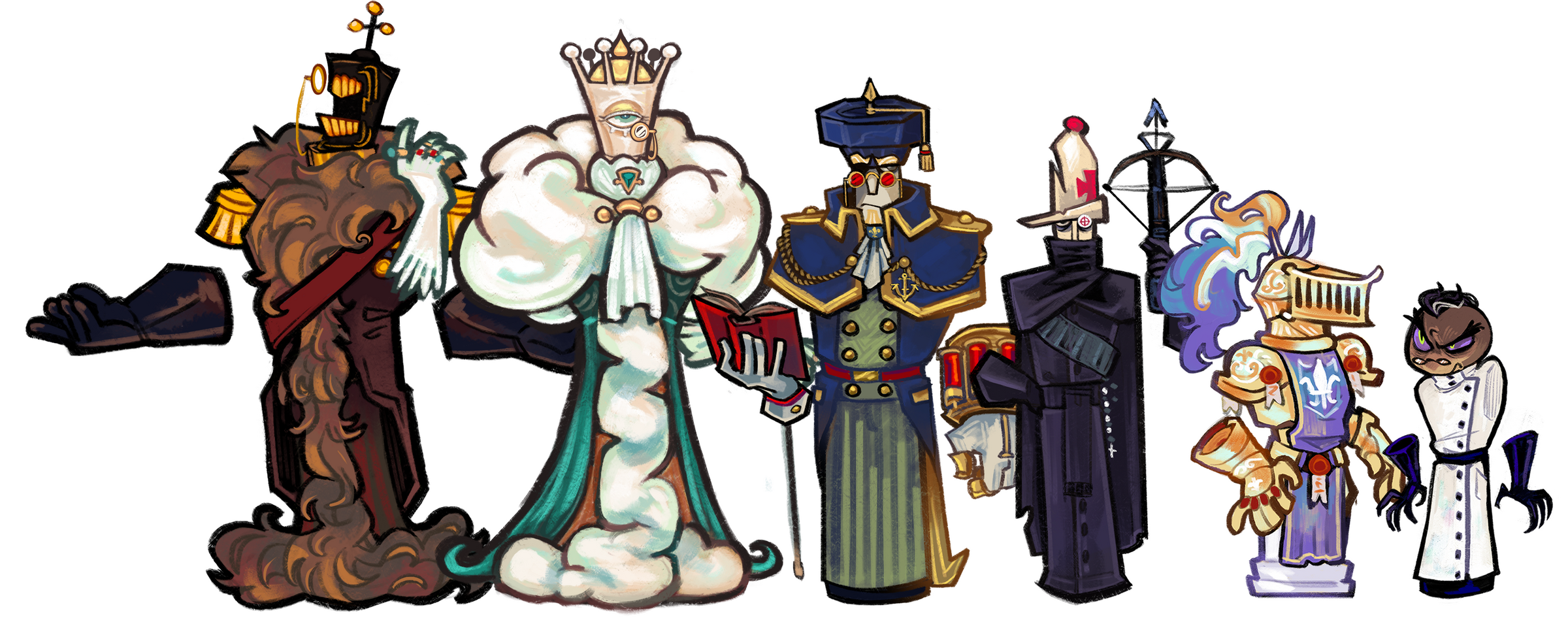 Bishops are a magically-inclined type of chessman, capable of constantly absorbing small amounts of ambient mana which they can then use to empower everything from their wounded allies to their oratory skills. They do this through the Apertures on their heads, phantoform-filled gaps that serve as both highly sensitive extrasensory organs and mana collectors, tempered and channeled through Globes--free-floating spheres attuned to the individual Bishop, which serve as a sort of innate magical focus. In order to avoid painful overexposure to stimuli, Bishops tend to cover their heads with their signature miters (which can in fact be other, non-miter hats.) They are often scientists, scholars, priests, advisors or spiritual leaders.