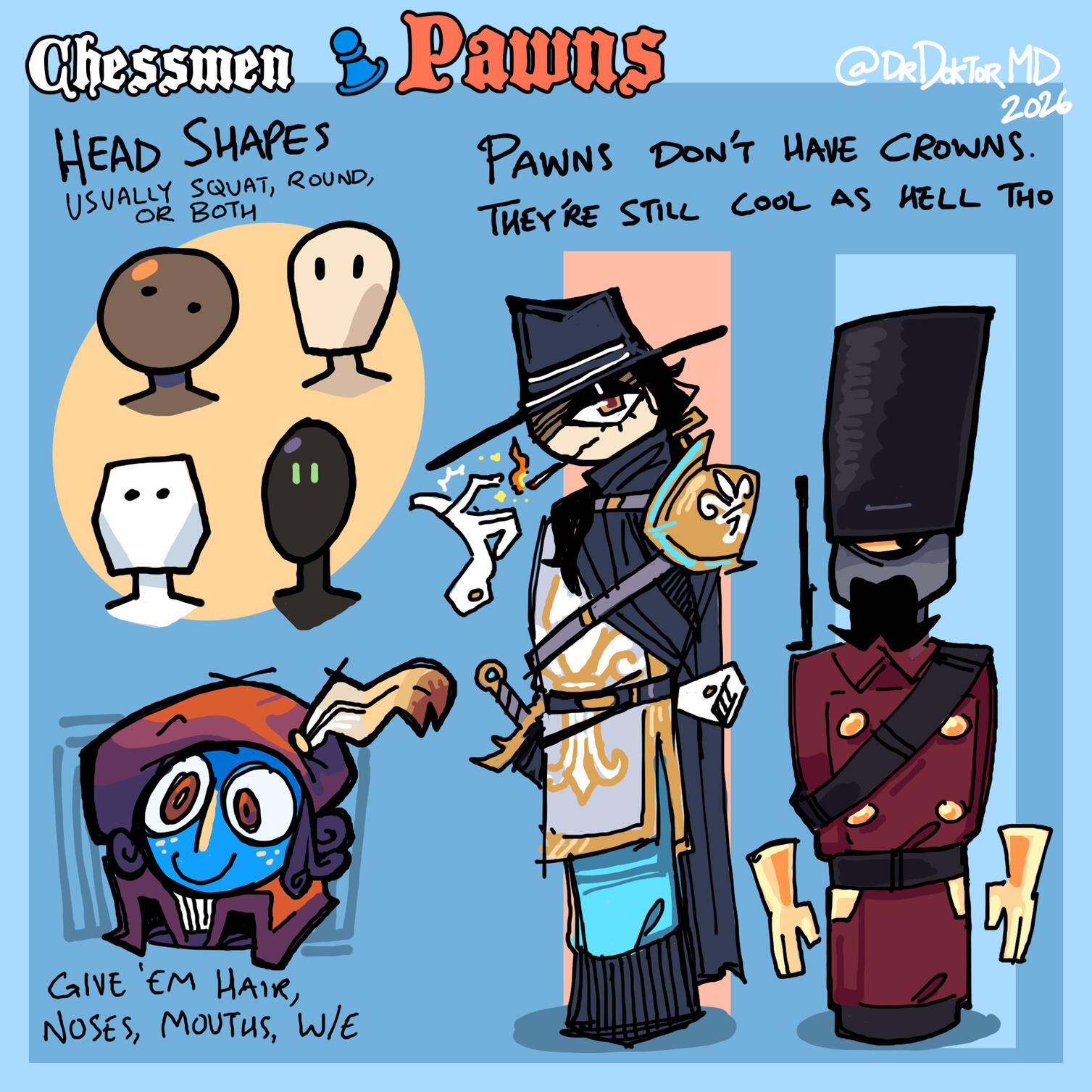 - Pawns are the builders and day-to-day operators of chessman society, and the most varied lot. Most of them have a strong core desire related to achieving something of value to themselves or to the people around them. Someone who is a Pawn is someone that wants to make a difference, and this means that they can and will go to great lengths to achieve incredible things: good or evil.- Even more than the rest of the chessmen, Pawns appreciate clear structure of some sort--even if that structure involves going on a myriad of differing adventures or doing dangerous things. So long as they have some idea of what they are supposed to do next, they can work tirelessly towards all sorts of incredible goals.- That said, while the other types of chessmen tend to keep a focus on a specific vocation, Pawns are extremely versatile. They excel at learning things or accomplishing tasks and then moving on to new fields, transcending genre and old limitations every time.- Pawns who feel especially strongly about a very specific calling might Promote to a different piece once they have begun to fulfill it. This often happens in childhood or at adolescence. Later Promotions are not completely unheard of, but are extremely rare.